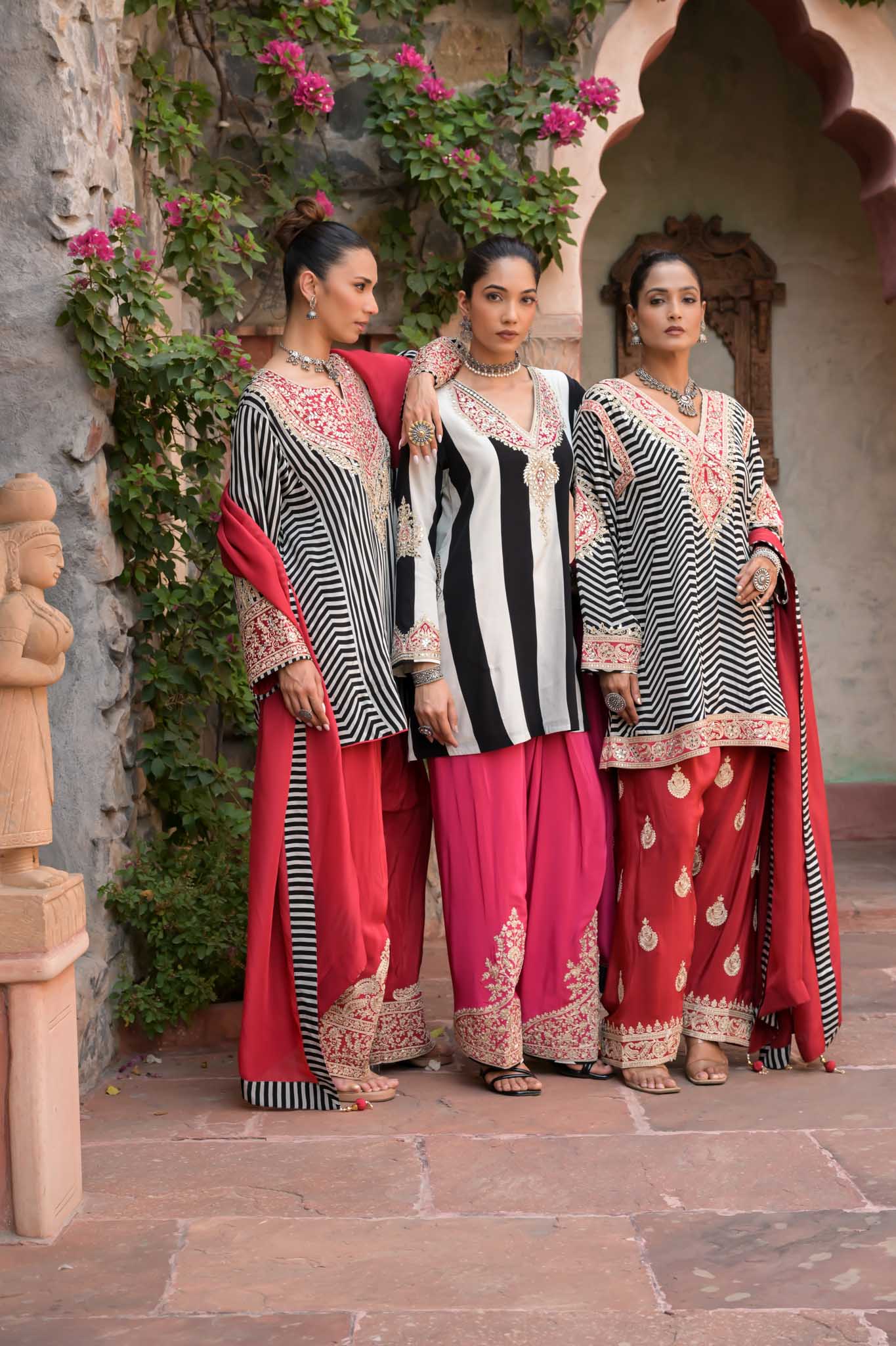 Gulab | Black & White Striped Kurta with Pink Embroidered Palazzo Set